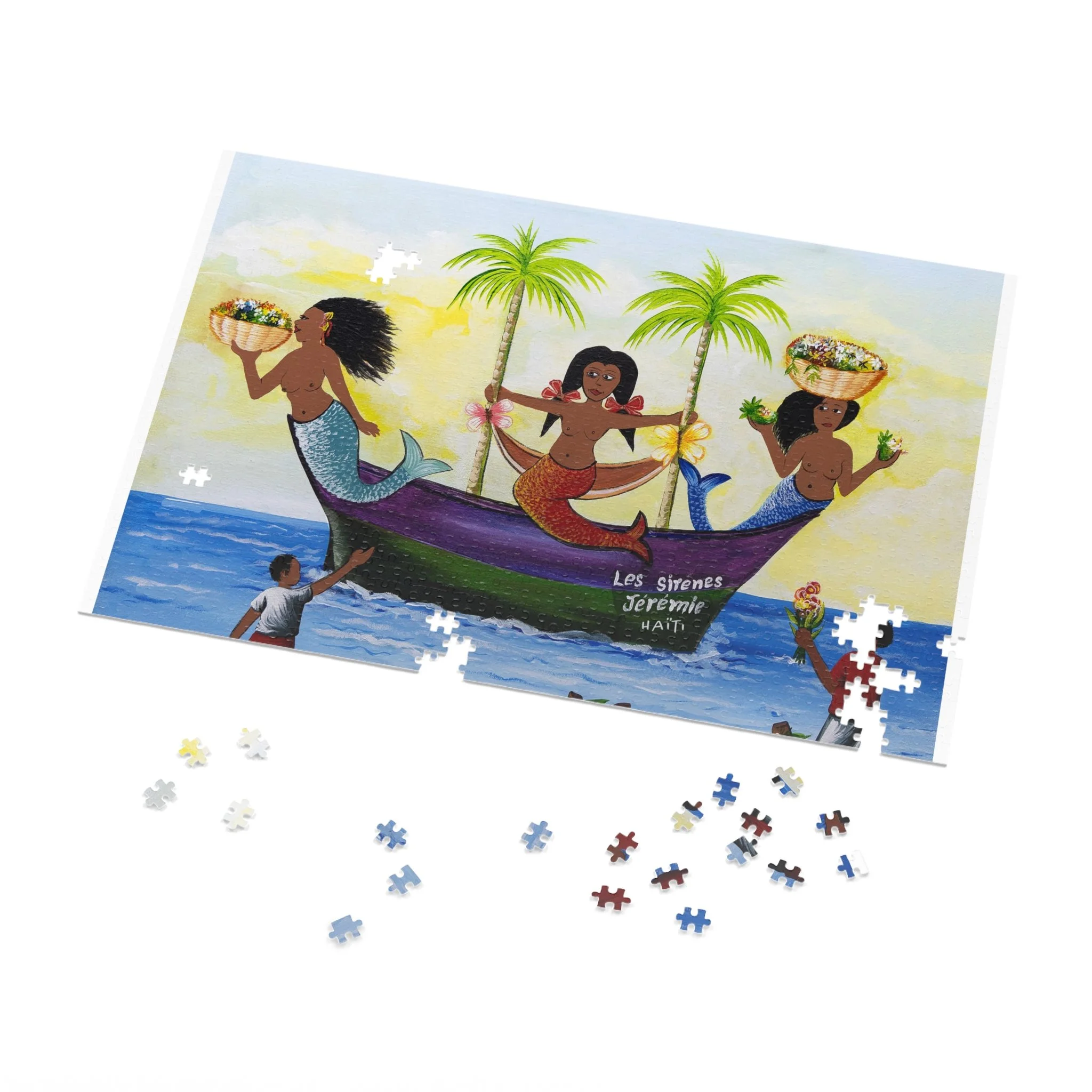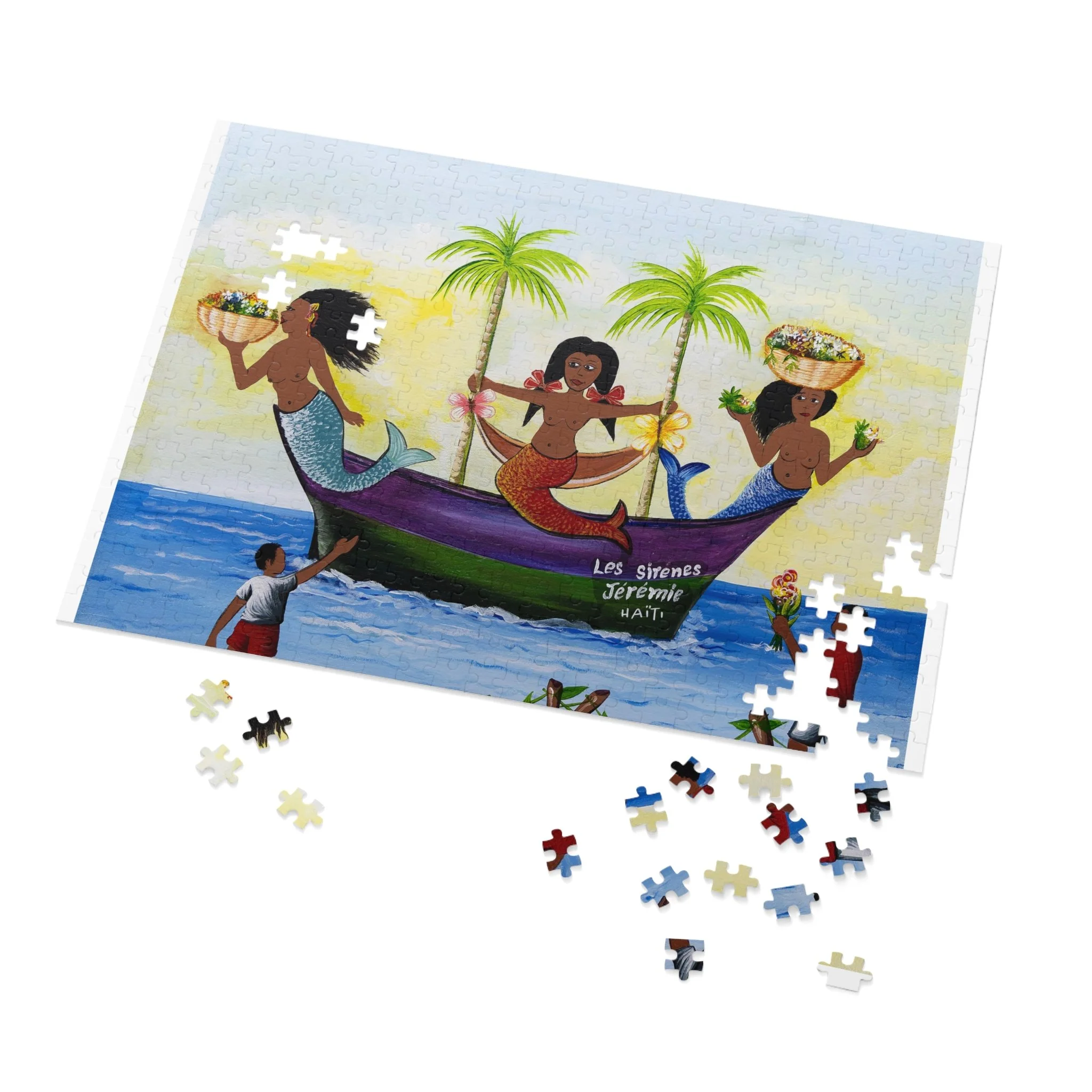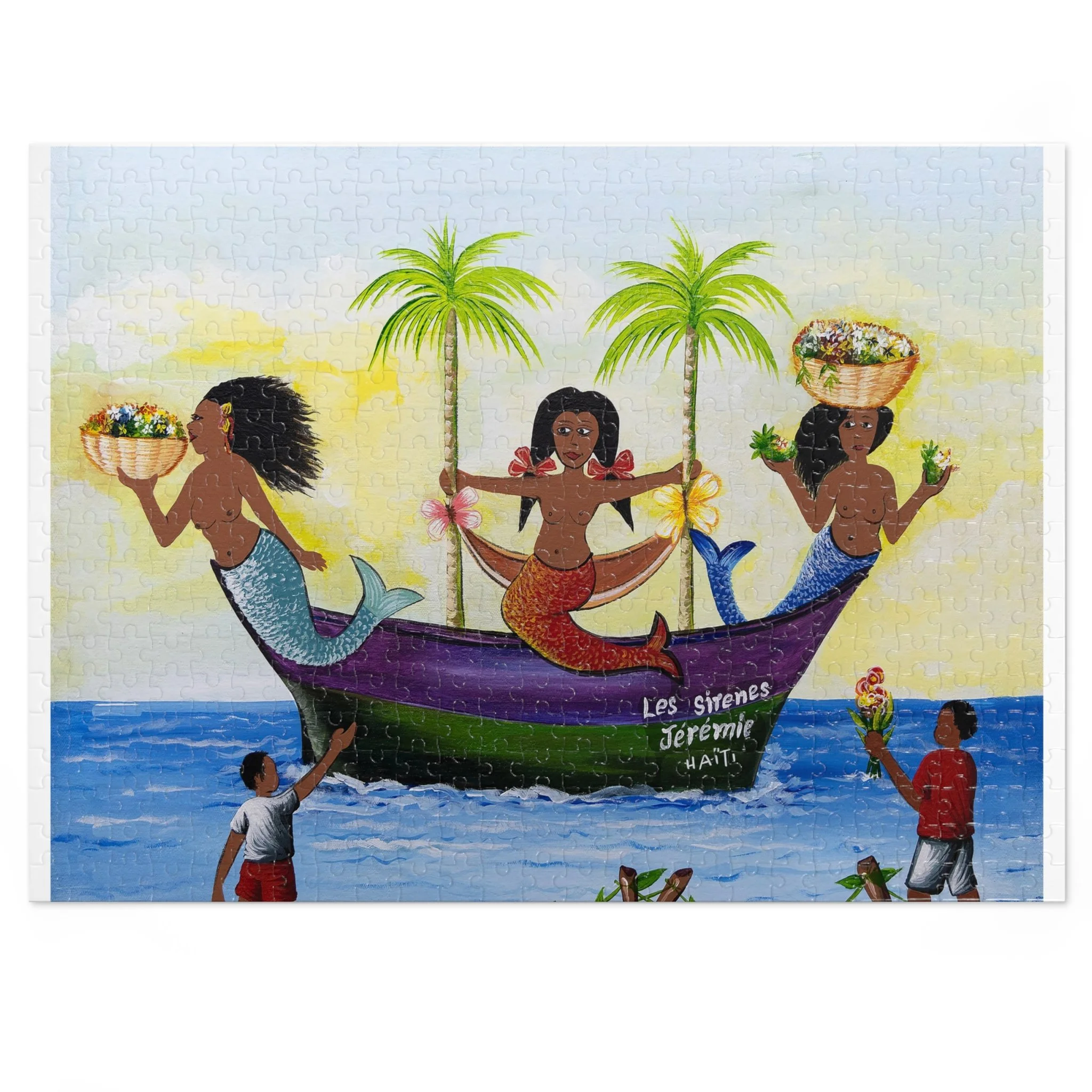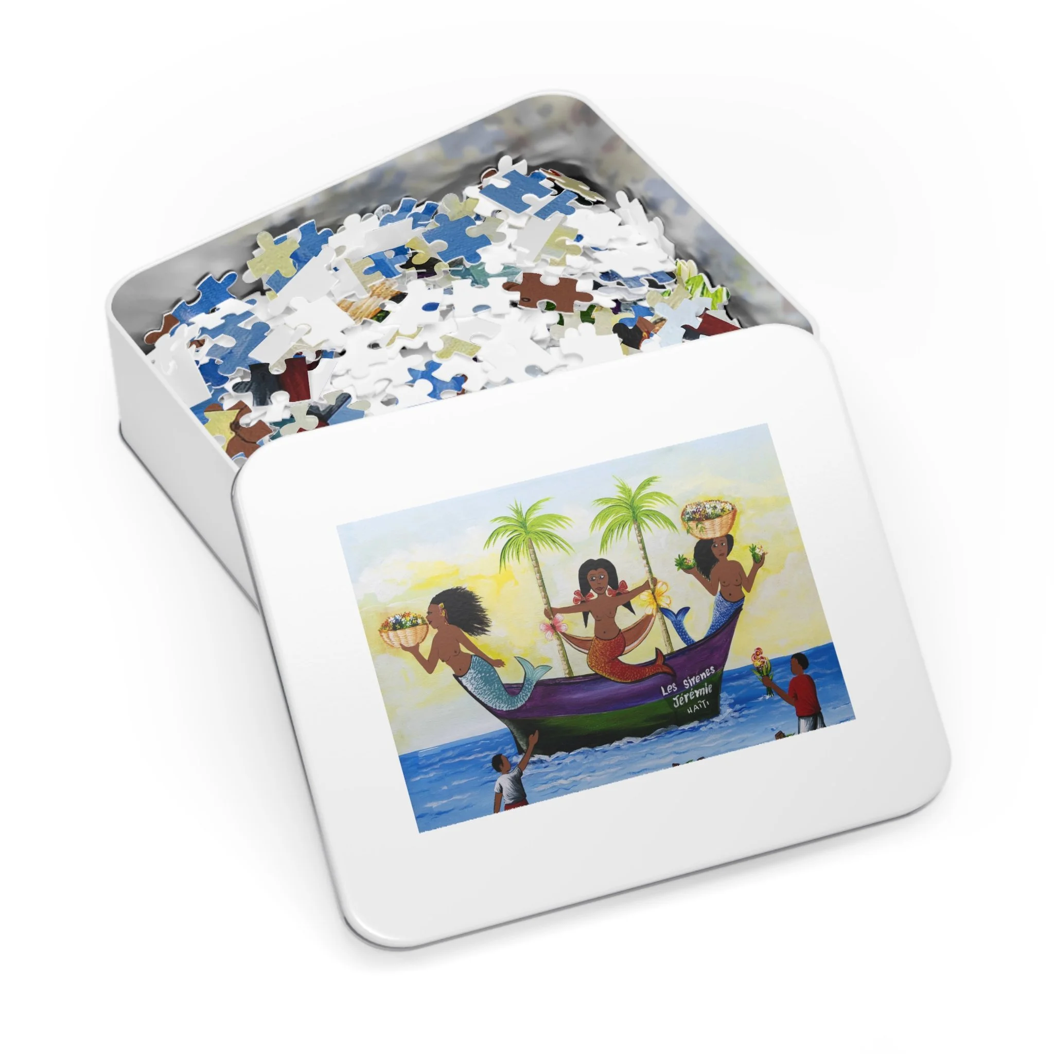 This high-quality puzzle recreates a vibrant Haitian-inspired painting of three mermaids on a colorful boat beneath swaying palms, with beachgoers and fresh produce along the water’s edge. As you fit each glossy chipboard piece into place, the colors pop and the story unfolds—laughter, trade, and the rhythm of island life. The finished image also appears on the tin cover and box, so the artwork continues to charm even when the puzzle is stored. It’s tactile, bright, and made to be assembled slowly—piece by piece—while you sip something warm and hum along to the scene’s quiet celebration of everyday coastal joy.