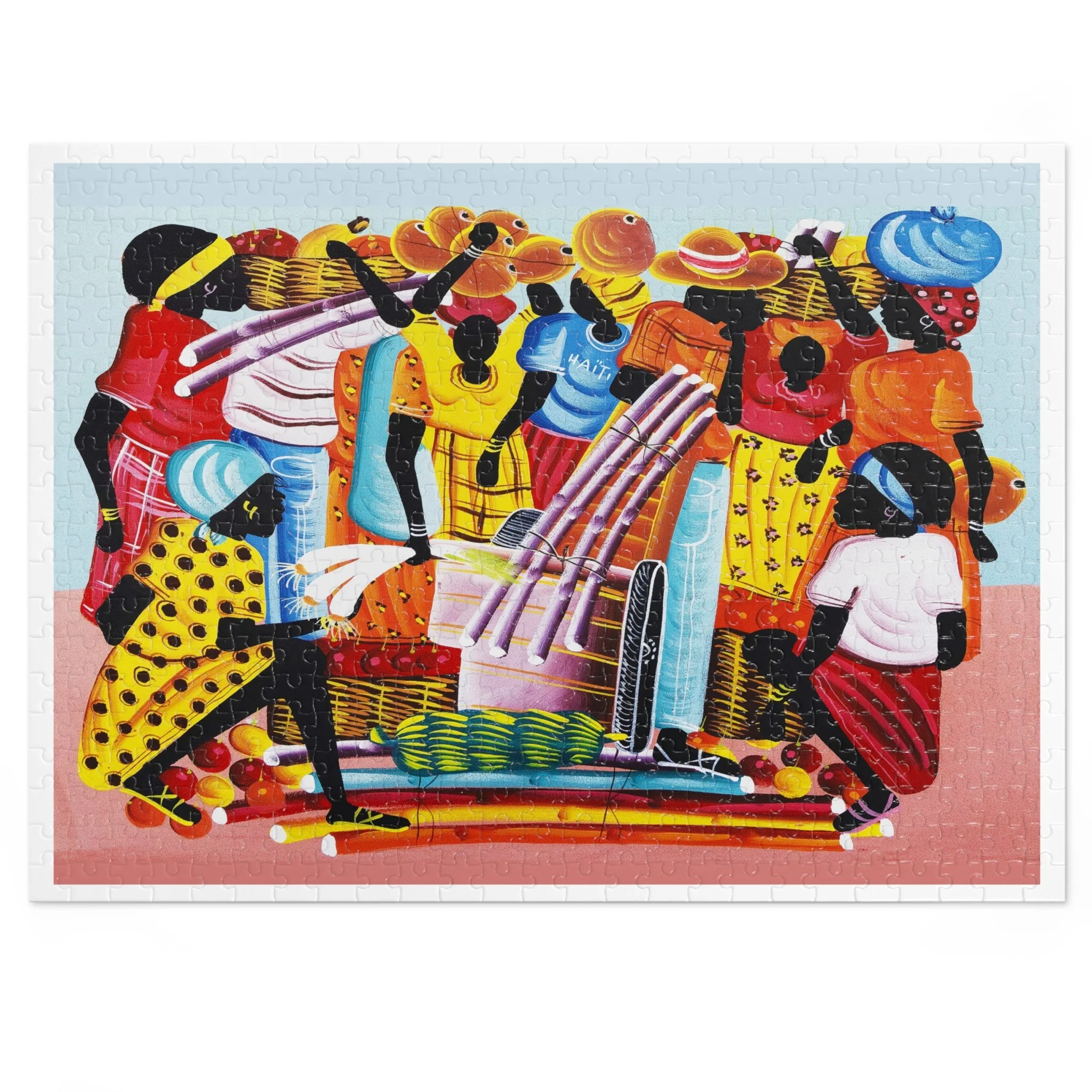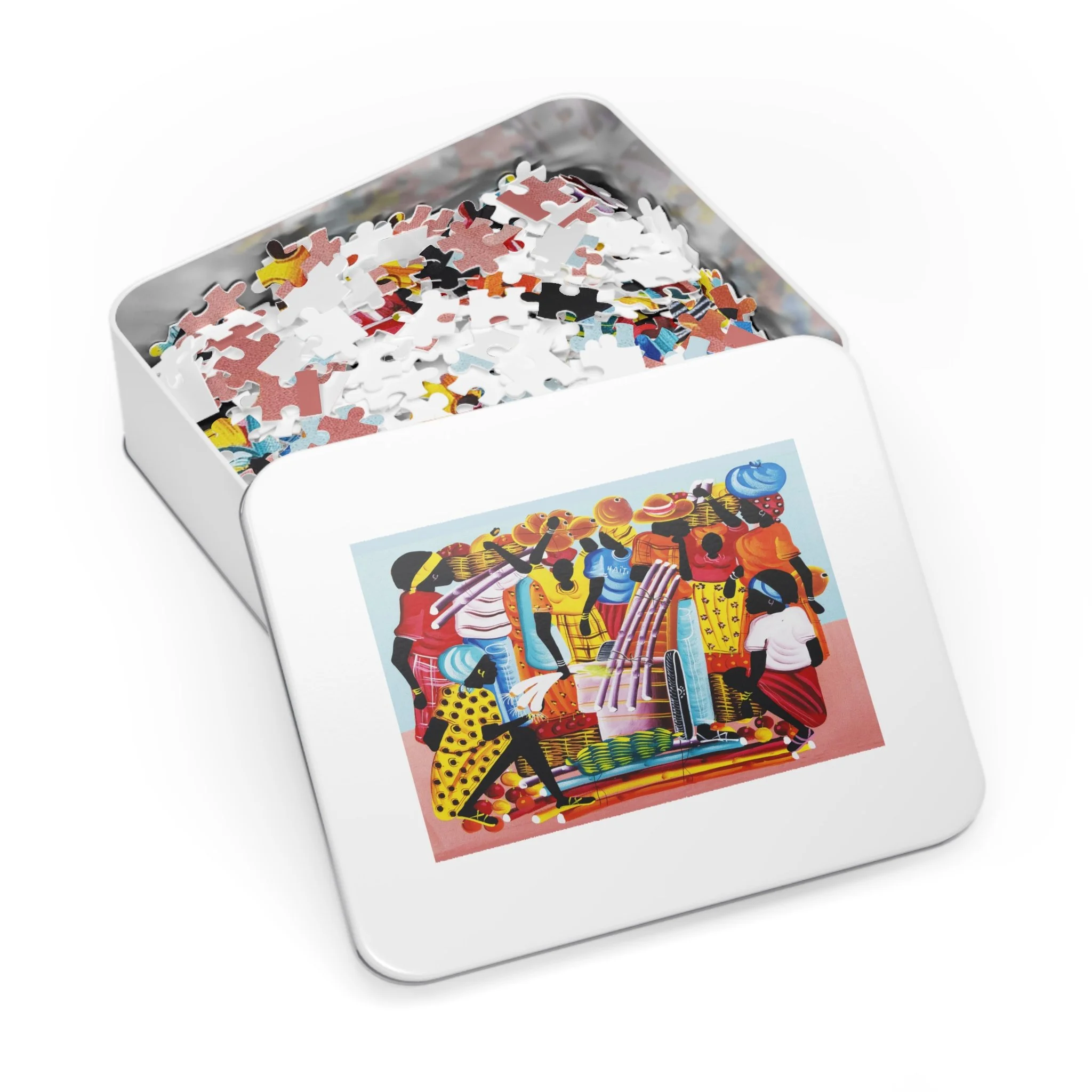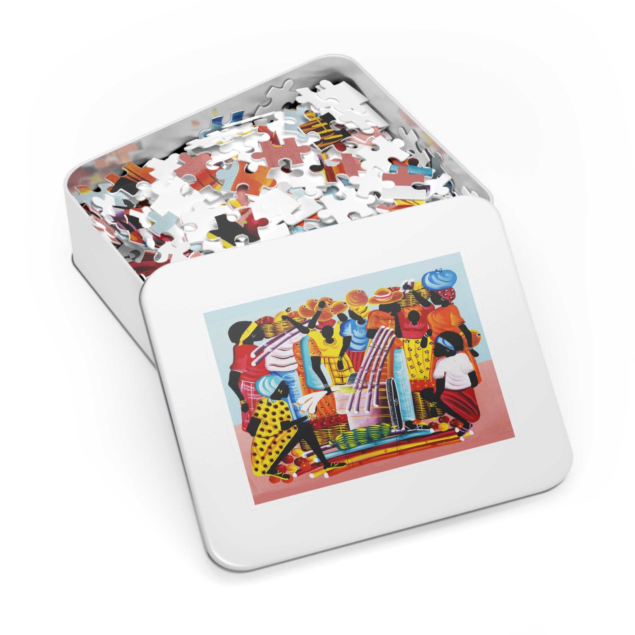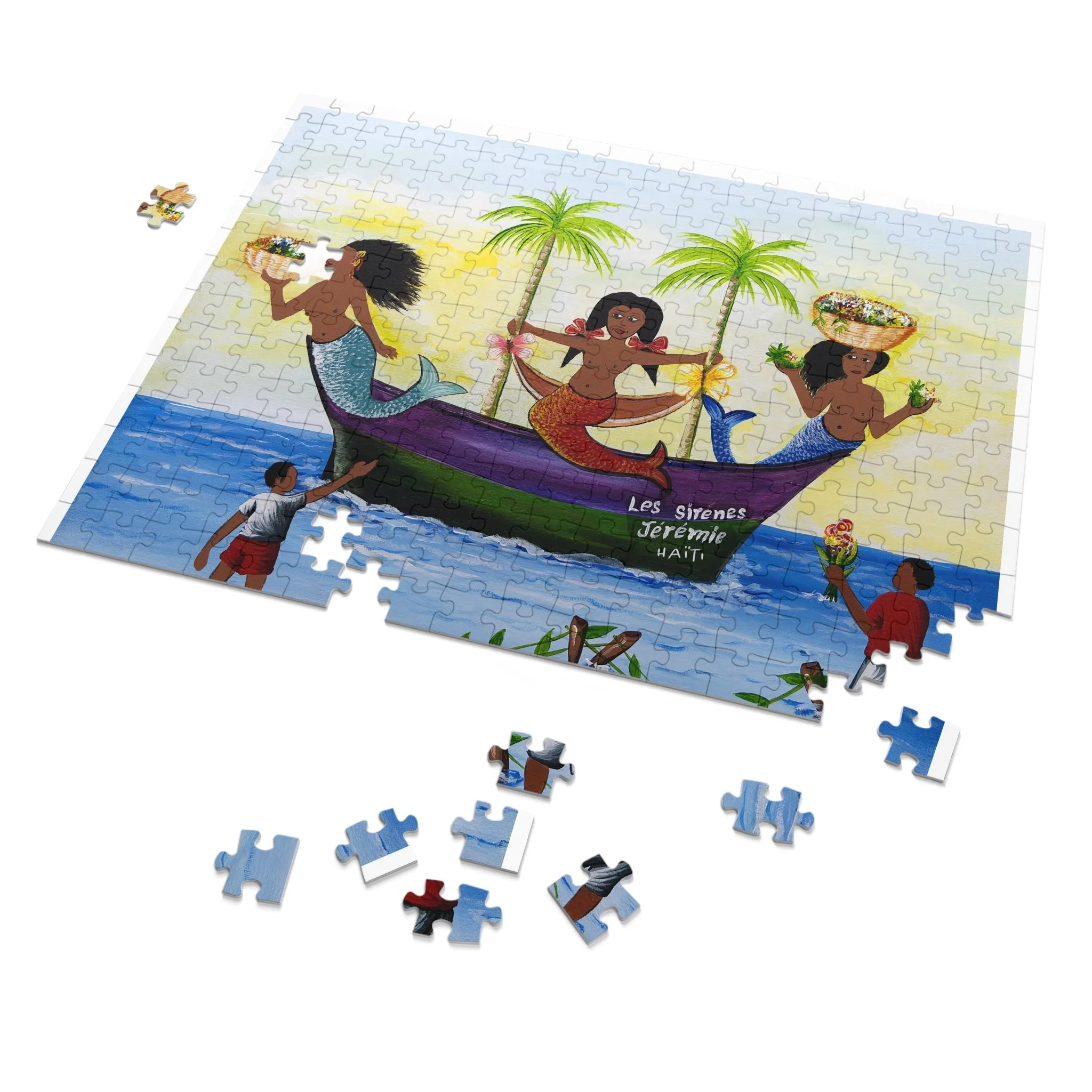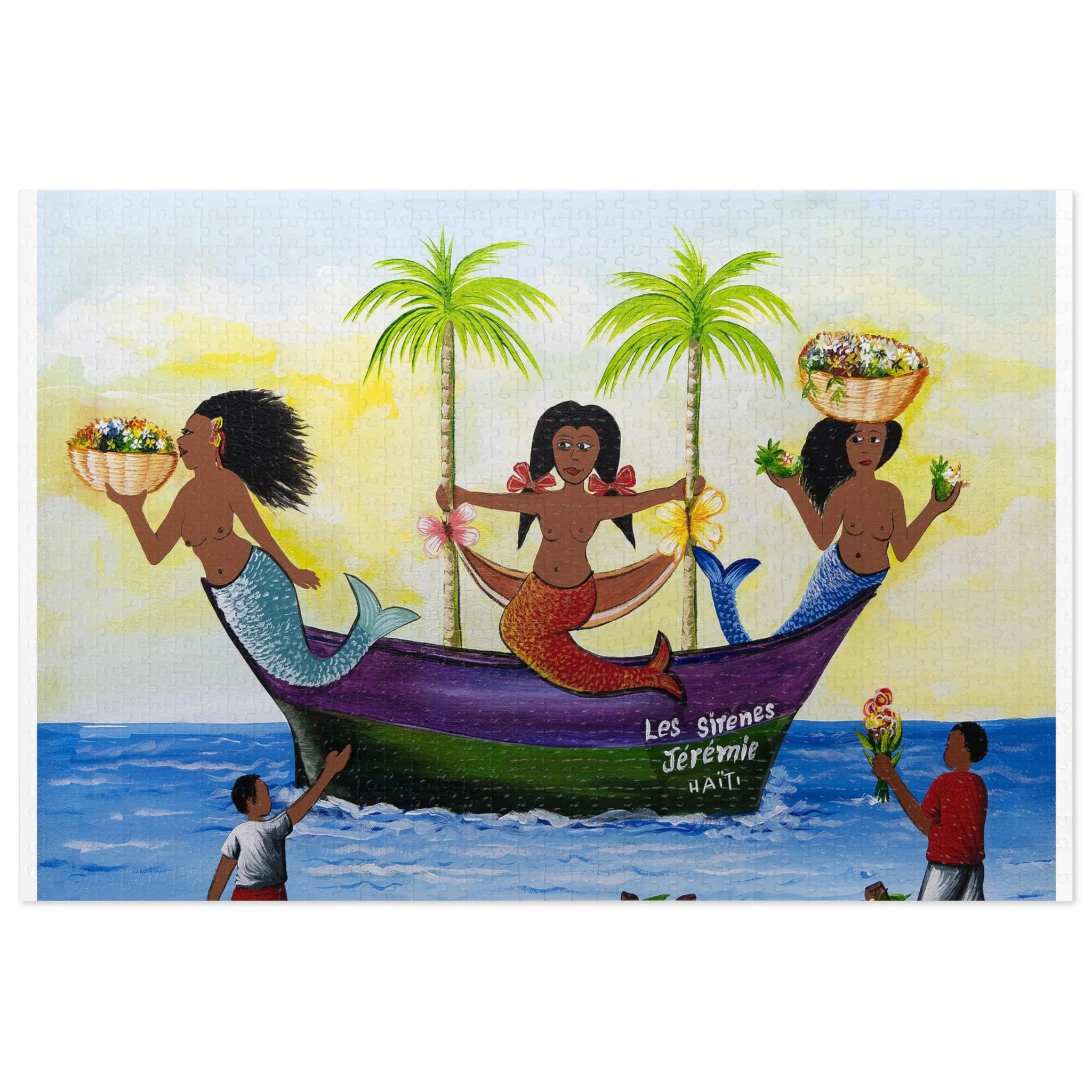 This high-quality puzzle recreates a vibrant Haitian-inspired painting of three mermaids on a colorful boat beneath swaying palms, with beachgoers and fresh produce along the water’s edge. As you fit each glossy chipboard piece into place, the colors pop and the story unfolds—laughter, trade, and the rhythm of island life. The finished image also appears on the tin cover and box, so the artwork continues to charm even when the puzzle is stored. It’s tactile, bright, and made to be assembled slowly—piece by piece—while you sip something warm and hum along to the scene’s quiet celebration of everyday coastal joy.