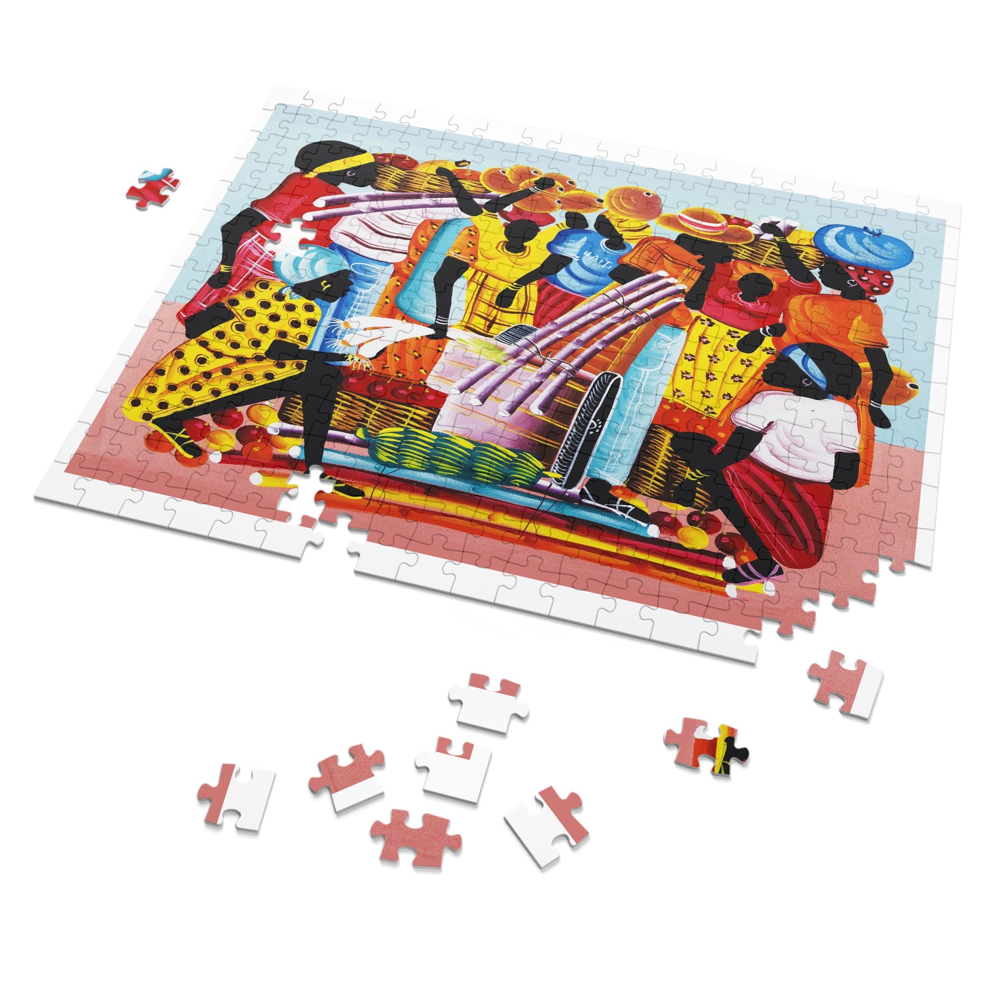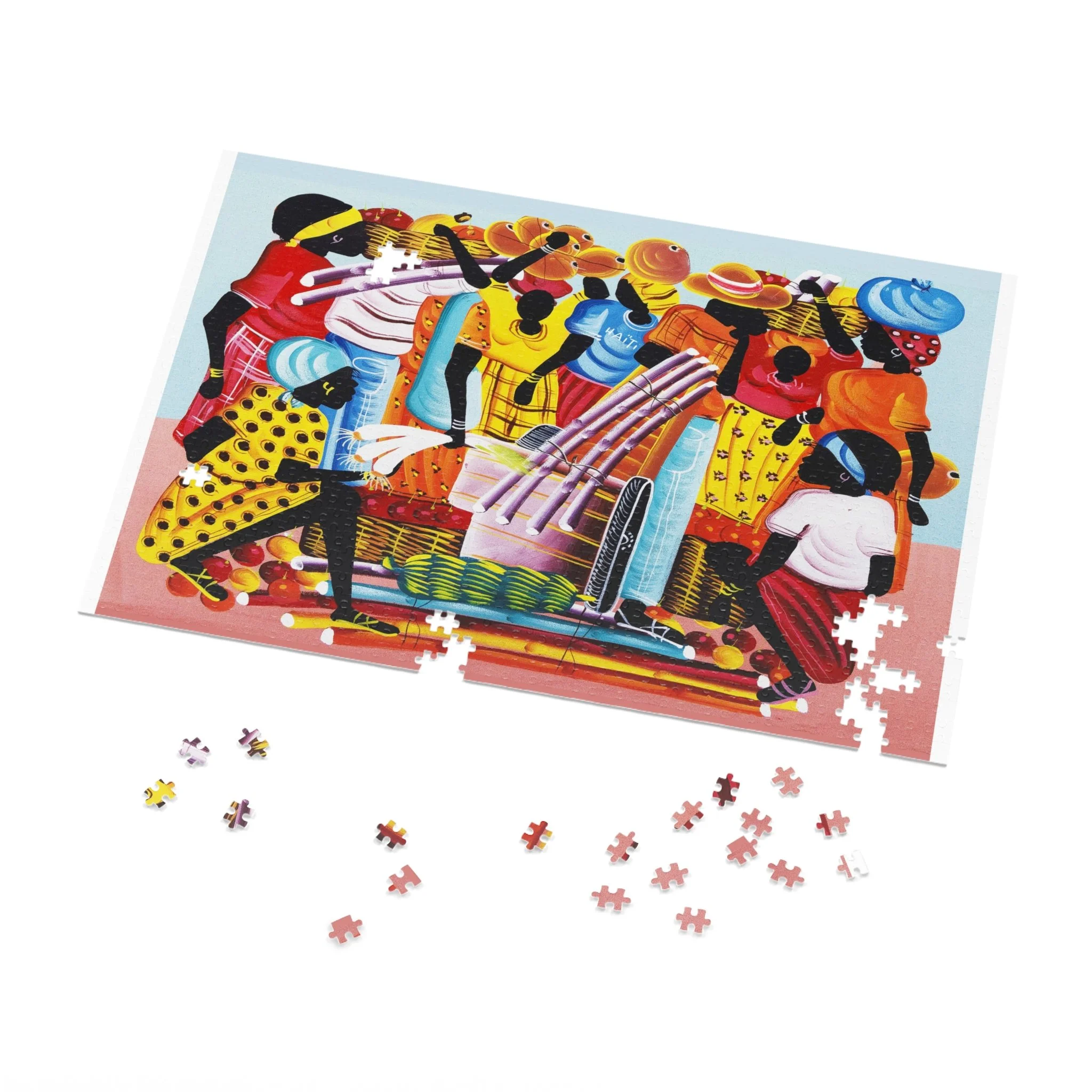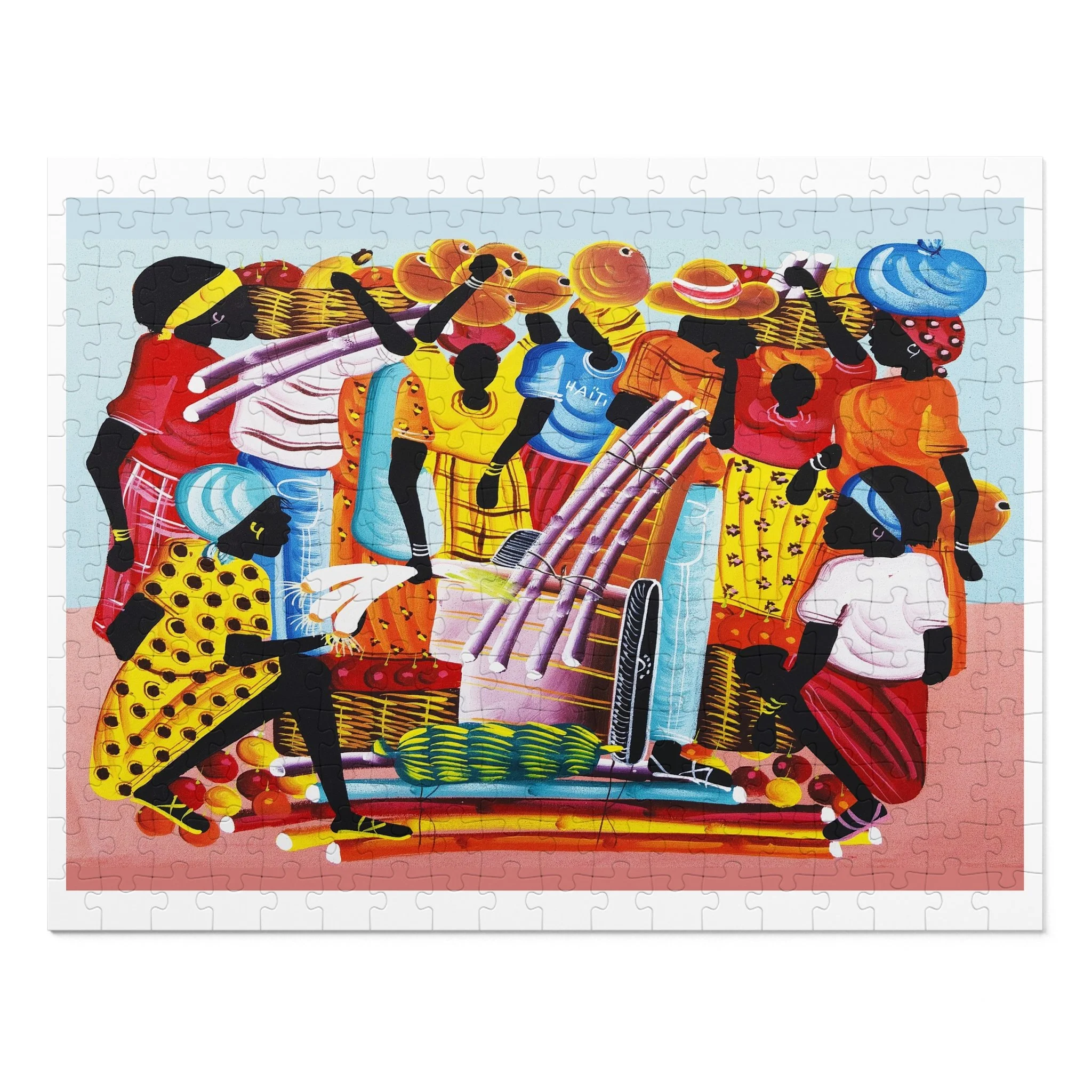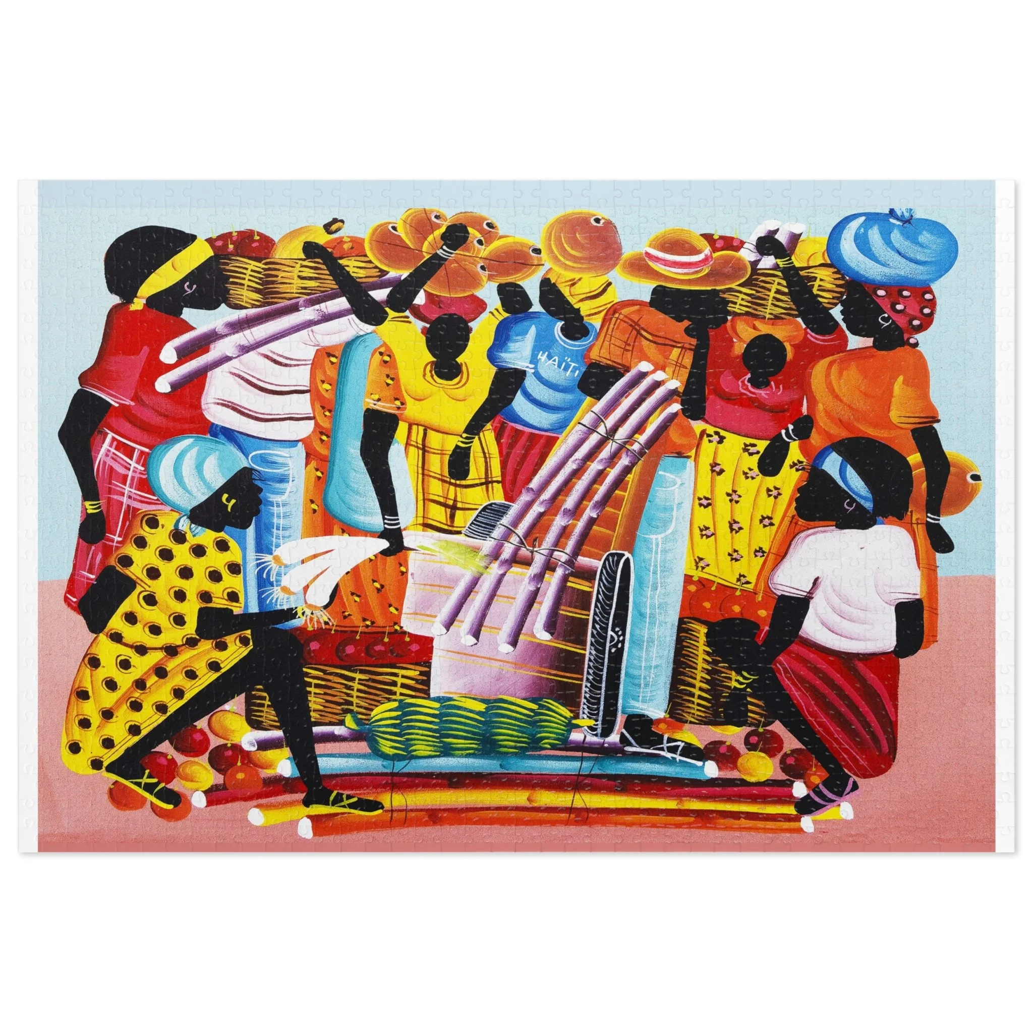 This high-quality puzzle recreates a vibrant Haitian-inspired painting of three mermaids on a colorful boat beneath swaying palms, with beachgoers and fresh produce along the water’s edge. As you fit each glossy chipboard piece into place, the colors pop and the story unfolds—laughter, trade, and the rhythm of island life. The finished image also appears on the tin cover and box, so the artwork continues to charm even when the puzzle is stored. It’s tactile, bright, and made to be assembled slowly—piece by piece—while you sip something warm and hum along to the scene’s quiet celebration of everyday coastal joy.